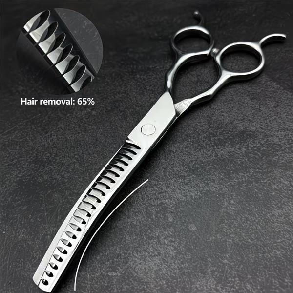 Kutyanyíró, állat nyíró olló, nem eltömődő fogazással, hajlított pengével, kettő újtámasszal. A professzionális, kutyakozmetikusoknak készült olló kiképzése lehetővé teszi mindenfajta nyírási művelet használatához.